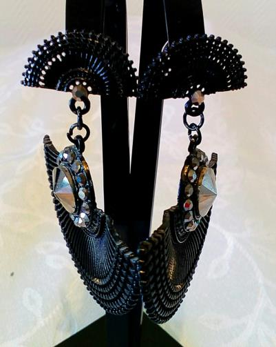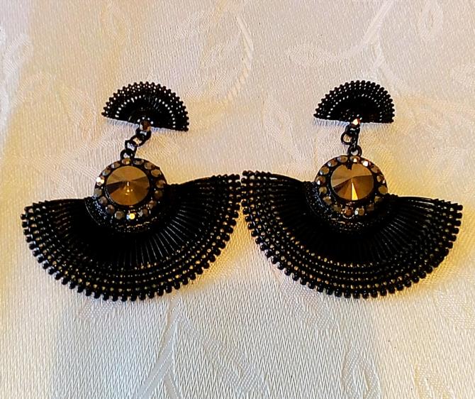 Peça de metal de cor preta cravejadas em pedras em duas composições em leques, a primeira medindo 1,5 cm alt. / 2,5 cm larg. , a segunda medindo 4,5 cm alt. / 6,0 cm larg.