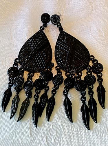 Peça de metal de cor preta em alto relevo tribal com 5 flagelos dividida em duas composições, a primeira medindo 1,0 cm alt. / 1,0 cm larg. , a segunda ( c/ flagelos) medindo 8,5 cm alt. / 2,5 cm larg.