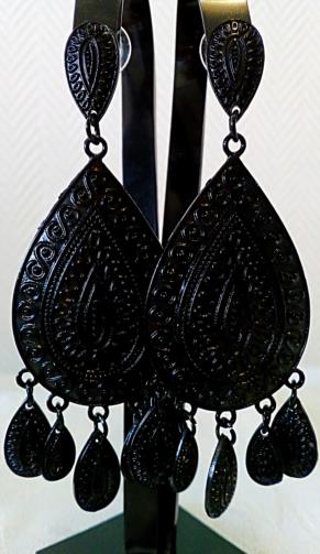 Peça de metal de cor preta em alto relevo tribal com 5 flagelos dividida em duas composições, a primeira medindo 1,5 cm alt. / 1,0 cm larg. , a segunda ( c/ flagelos) medindo 7,0 cm alt. / 3,0 cm larg.