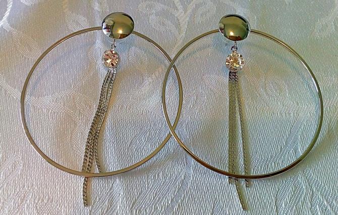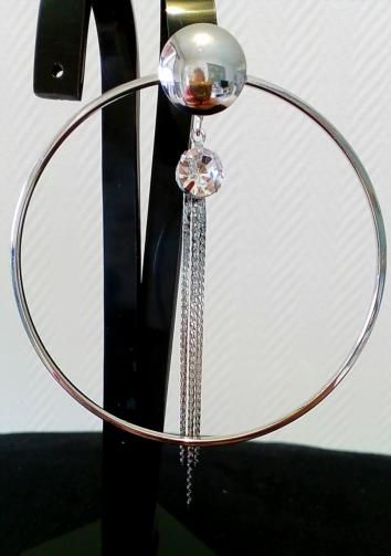 Peça de metal prateado em forma de argola com pingente de pedra com três faixas prateadas medindo 6,5 cm de diâmetro, e o pingente 7 cm.