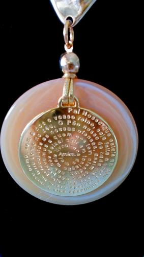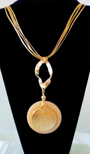 Cordão com 4 tiras em couro sintético maleável revestidas de dourado medindo 50 cm , contendo um estrutura de metal retorcido dourado medindo 4 cm ligando em um pingente de acrílico ocre com um disco de metal dourado com uma gravação da oração do Pai -Nosso medindo 5 cm.