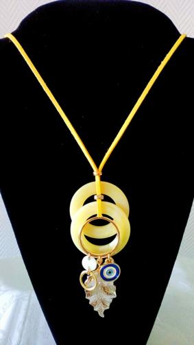 Cordão em tira de camurça amarelo medindo 92 cm ligado a dois discos de acrílico amarelo de 4 cm cada e um aro dourado medindo 2,5 cm com 3 pingentes sendo uma folha dourada de 4 cm , um olho grego de 1,5 cm e um aro dourado de 1,5 cm.