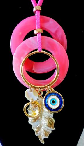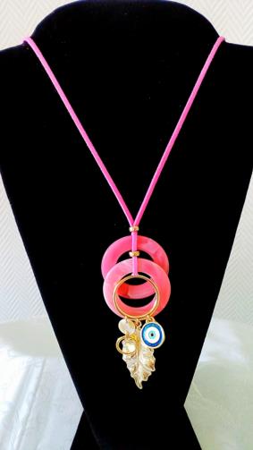 Cordão em tira de camurça rosa medindo 80 cm ligado a dois discos de acrílico rosa de 4 cm cada e um aro dourado medindo 2,5 cm com 3 pingentes sendo uma folha dourada de 4 cm , um olho grego de 1,5 cm e um aro dourado de 1,5 cm.