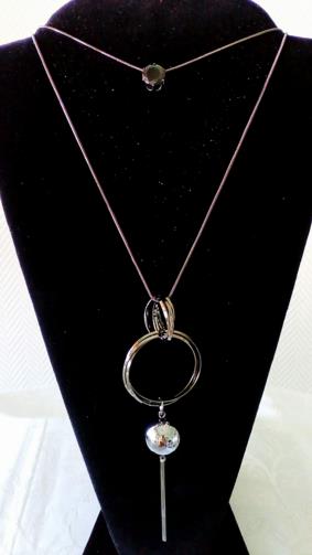 Dois cordões em metal grafite em um mesmo feixe medindo 72cm, sendo um cordão contendo uma estrutura de metal grafite com uma pedra tipo zircônio medindo 1,0 cm , o segundo cordão com 3 anéis de 2,0 cm ,sendo transpassado por 4 aros em metal grafite de 3,0 cm cada, nesses quatro aros transpassa um pingente de esfera grafite ligada a um cilindro de metal grafite medindo 5,0 cm .