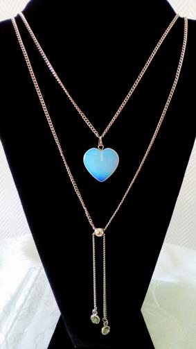 Dois cordões em metal prateado em um mesmo feixe medindo 59 cm, sendo uma gargantilha com um pingente de coração em pedra branca de efeito fluorescente medindo 2,5 cm, e o segundo cordão com uma esfera prateada que estrutura uma corrente em metal prateado ajustável medindo 17 cm com acabamento em suas duas pontas em dois pingentes em metal com uma pedra tipo zircônio de 1 cm.