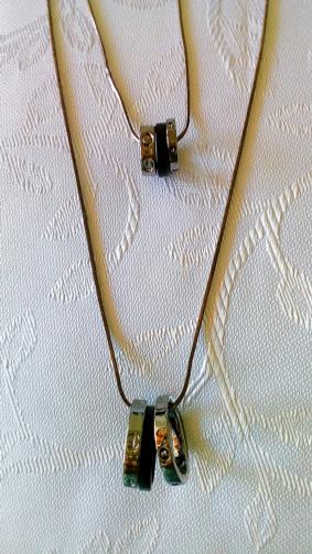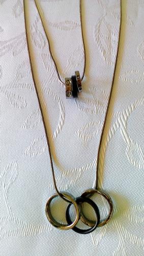 Dois cordões em metal grafite em um mesmo feixe medindo 78 cm, sendo um cordão com 3 anéis de 1,5 cm sendo 2 em metal grafite e um preto, o segundo cordão com 3 anéis de 2,0 cm sendo 2 em metal grafite e um preto.