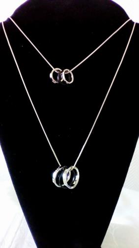Dois cordões em metal prateado em um mesmo feixe medindo 78 cm, sendo um cordão com 3 anéis de 1,5 cm sendo 2 em metal prateado e um preto, o segundo cordão com 3 anéis de 2,0 cm sendo 2 em metal prateado e um preto.