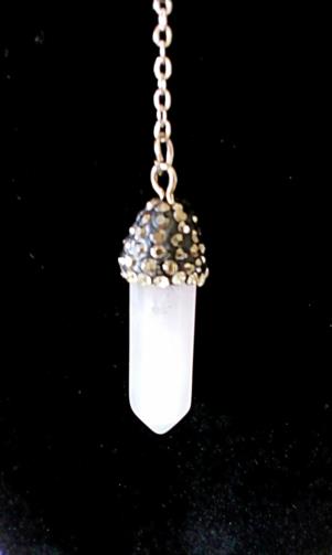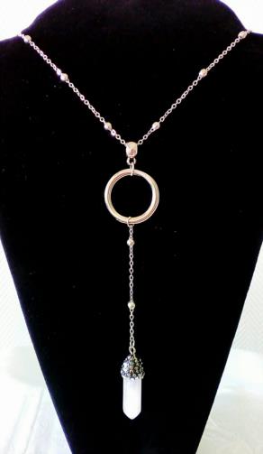 Cordão em metal prateado com esferas intermitentes medindo 50 cm com um pingente em aro prateado medindo 3 cm anexado ao aro uma corrente em metal prateado intermitente medindo 6 cm finalizando em um segundo pingente de cristal rosa com acabamento em uma de suas pontas em metal cravejado de pedras medindo 3 cm ( cristal rosa é uma pedra que atrai e protege as energias dos relacionamentos amorosos ).
