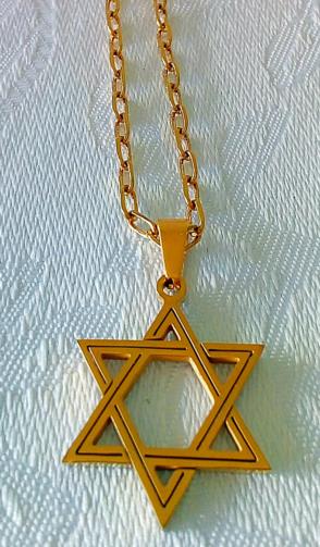 Cordão em aço inox 316L dourado medindo 58 cm, com pingente em aço inox dourado com um símbolo da estrela de Davi medindo 2,5 cm.
