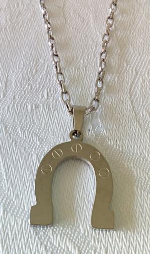 Cordão em aço inox 316L medindo 58 cm, com pingente em aço inox com um símbolo da ferradura medindo 2,5 cm (A Ferradura é um objeto que simboliza a sorte, a energia positiva e a proteção)