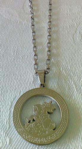 Cordão em aço inox 316L medindo 58 cm, com pingente em aço inox com um símbolo de São Jorge com um estetoscópio medindo 3,0 cm.