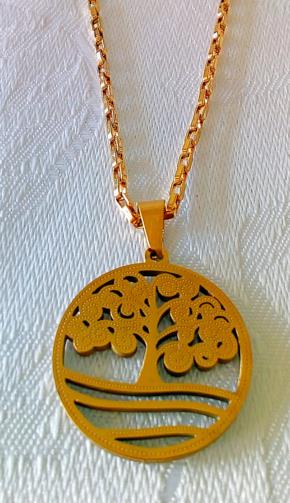 Cordão em aço inox 316L dourado medindo 58 cm, com pingente em aço inox dourado com um símbolo da a Arvore da Vida medindo 3,0 cm ( o significado da árvore da vida é nos lembrar que ficar parado no mesmo lugar não é uma opção. Enquanto está viva, ela cresce e se renova)