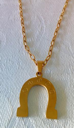Cordão em aço inox 316L dourado medindo 58 cm, com pingente em aço inox dourado com um símbolo da ferradura medindo 2,5 cm (A Ferradura é um objeto que simboliza a sorte, a energia positiva e a proteção)