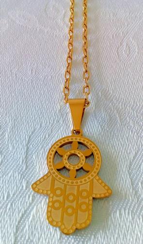 Cordão em aço inox 316L dourado medindo 58 cm, com pingente em aço inox dourado do símbolo da mão de Hamsá medindo 3,0 cm (o símbolo representa um amuleto que cada dedo da mão representa fé, oração, caridade, jejum e peregrinação)