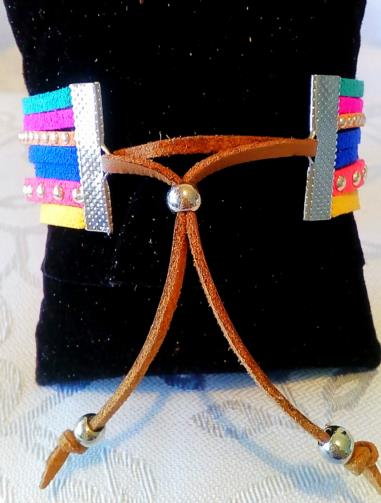 Pulseira quíntupla de couro sintético medindo 20 cm ajustável colorida. Uma faixa dupla com dois corações em metal e pedra de brilho, uma faixa pregueada, uma faixa com a palavra “Paz” em metal, uma faixa pregueada, uma faixa com uma montagem com 3 pingentes de pedra de brilho.