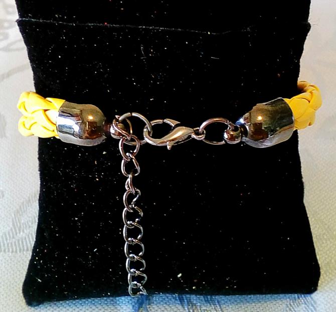 Pulseira dupla trançada em couro sintético na cor amarela medindo 20 cm ajustável ( mais 6 cm ) com acabamentos em metal ônix com 5 pingentes em metal .