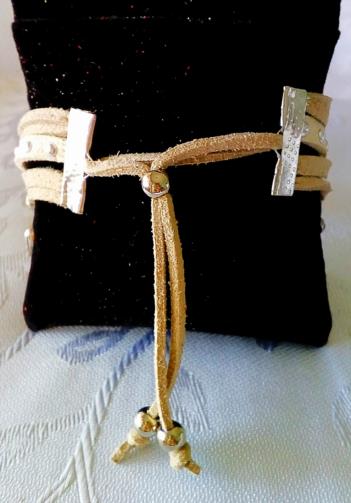 Pulseira quádrupla de couro sintético medindo 20 cm ajustável na cor areia. Na primeira faixa temos 5 pingentes ( uma chave, um elefante, um símbolo oriental e duas pedras de brilho), segunda faixa pregueada, a terceira faixa possui 4 enfeites de símbolos da paz e a quarta faixa possui 8 pedras de brilho.