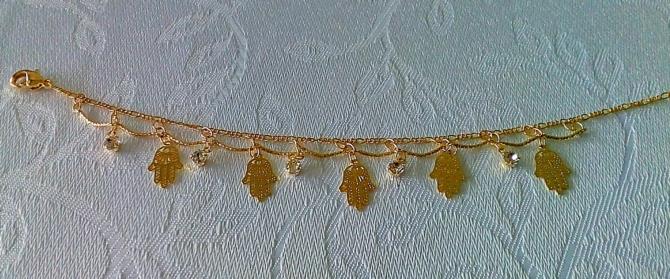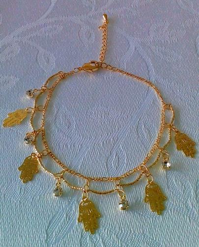 Pulseira dupla em metal dourado medindo 18 cm. ajustável (+2cm.) com 5 pingentes da Mão de Hansá e 5 pingentes de pedras de brilho.