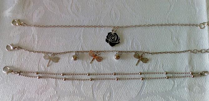 Pulseira tripla em metal ônix medindo 18 cm. ajustável (+7cm.) uma com um pingente de rosa de cor preta, outra com 3 pingentes de borboleta e 2 pedras de brilho e outra corrente de bolinhas. Podem ser usadas separadamente.