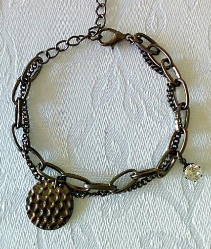 Pulseira tripla em metal ônix medindo 18 cm. ajustável (+7cm.) com 2 pingentes de 1,5 cm ( uma placa estilizada, uma pedra de brilho)