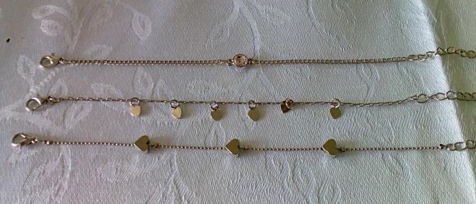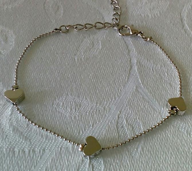 Pulseira tripla em metal prateado medindo 18 cm. ajustável (+7cm.) uma com uma pedra de brilho, outra com 3 corações em metal prateado e outra corrente com 6 folhinhas de metal. Podem ser usadas separadamente.