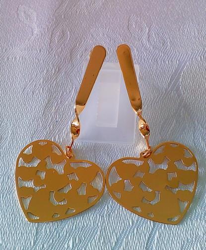 Peça de metal de cor dourada de haste retorcida medindo 4,0 cm com um pingente de coração estilizado medindo 3,5 cm diâmetro.