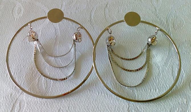 Peça de metal prateada em forma de argola anexada na parte de dentro um pingente de pedras em forma de colar triplo com três faixas prateadas medindo 6,0cm de diâmetro.
