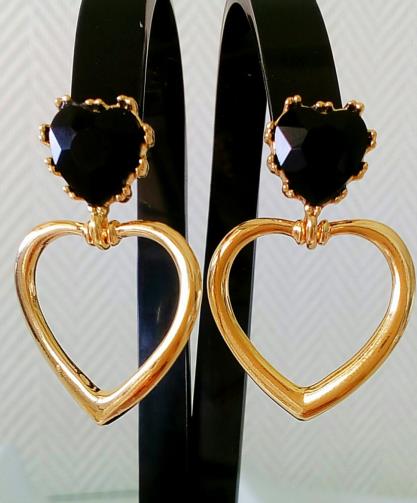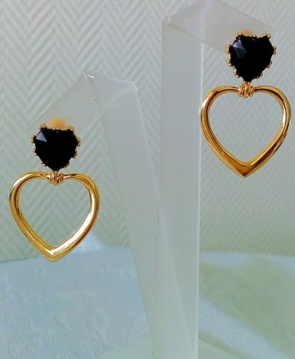Peça de metal dourado em forma de coração com uma estrutura metálica em forma de coração contendo uma pedra preta medindo 3,5 cm.