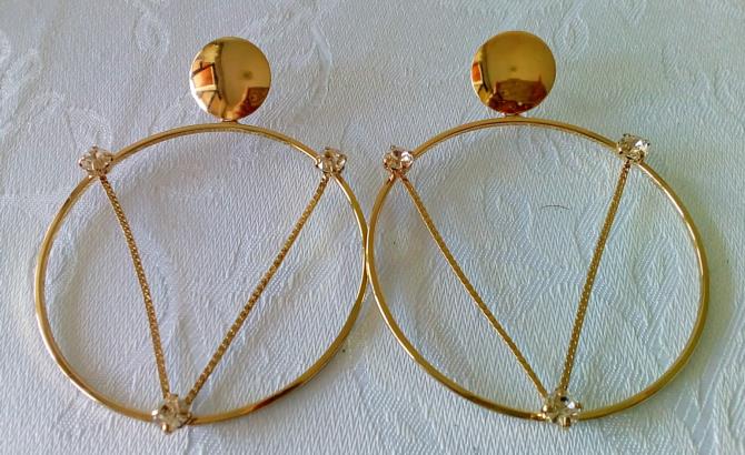 Peça de metal dourado em forma de argola com detalhe em “V” medindo 6,5 cm de diâmetro, com 3 pedras de brilho.