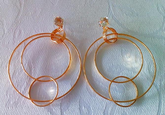 Peça em metal cor dourada disposta em duas argolas e dois anéis com uma estrutura com uma pedra de brilho medindo 9,5 cm.