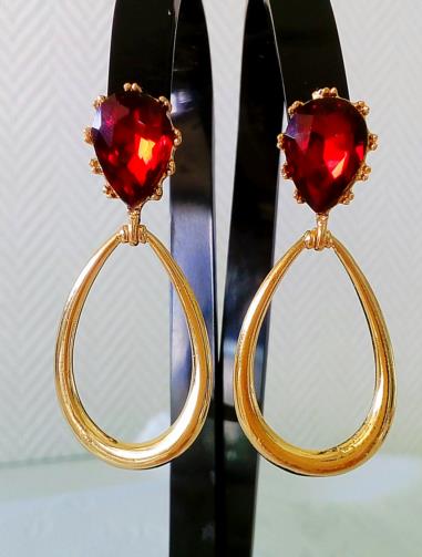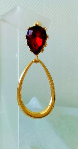 Peça de metal de cor dourada em forma de gota com estrutura metálica com uma pedra de cor vermelha medindo 5,0 cm.