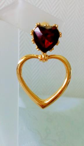 Peça de metal dourado em forma de coração com uma estrutura metálica em forma de coração contendo uma pedra vermelha medindo 3,5 cm.