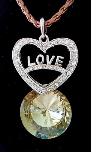 Cordão em couro sintético de cor marrom medindo 45 cm com uma peça metálica prateada em forma de coração cravejada de pedras medindo 3 cm anexada a uma pedra de vidro de efeito medindo 3cm.