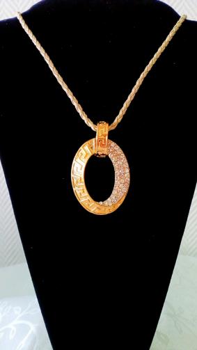 Cordão em couro sintético de cor areia medindo 45 cm com uma peça metálica oval dourada com detalhes e cravejada de pedras medindo 5 cm e suporte oval de 2 cm.