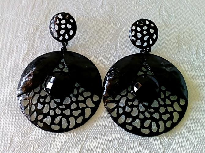 Peça de metal dourado retorcido na cor preta em forma de Escudo Estilizado com uma pedra preta no centro medindo 5 cm.