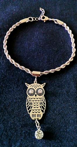 Pulseira de metal prateado trançado medindo 18 cm ajustável (+ 3cm) com um pingente de coruja prateada estilizada detalhada com uma pedra de brilho medindo 3 cm.