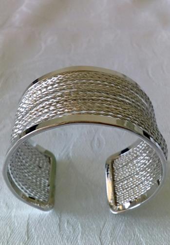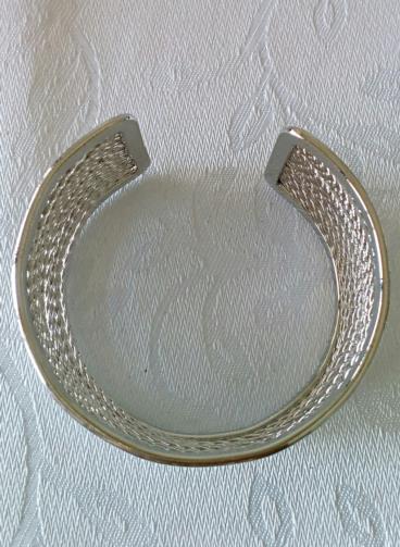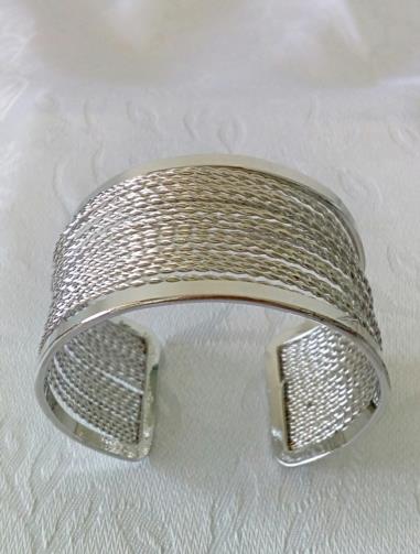 Pulseira Bracelete semi aberto em metal prateado com aproximadamente 24 tranças de fios metálicos prateados medindo 3,3cm de largura e 17,5 de circunferência.