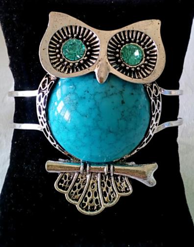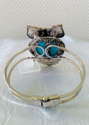 Pulseira Bracelete em metal prateado articulada ( abre e fecha) em forma de coruja detalhada com os olhos em pedra azul medindo 1,5cm de largura e 20,5cm de circunferência.