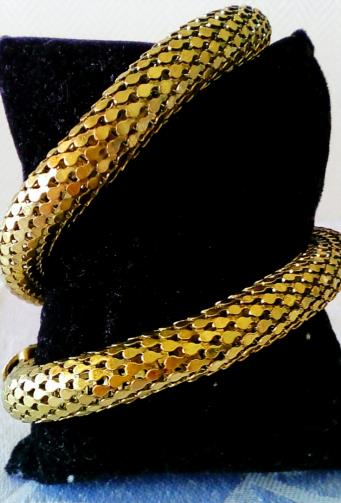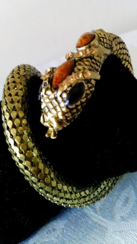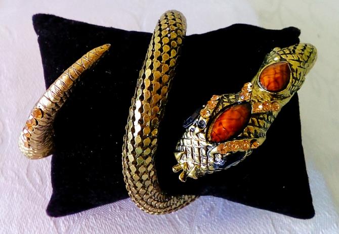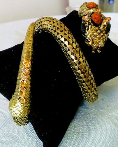 Peça em metal dourado maleável articular medindo 49cm em forma de cobra detalhada cravejado de pedras douradas, marrons e pretas. .