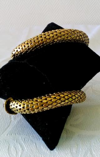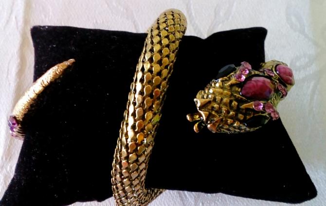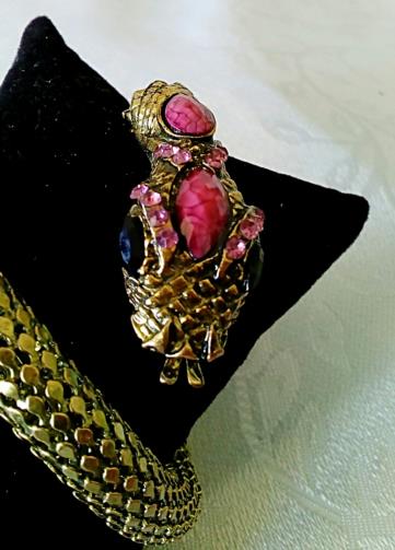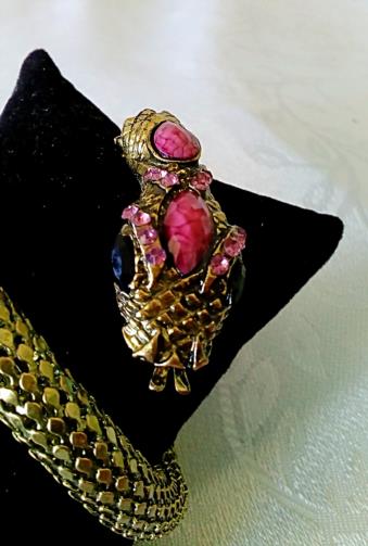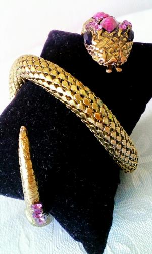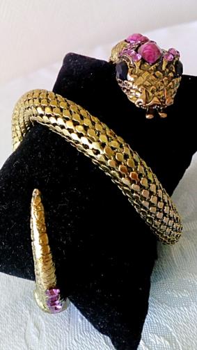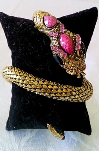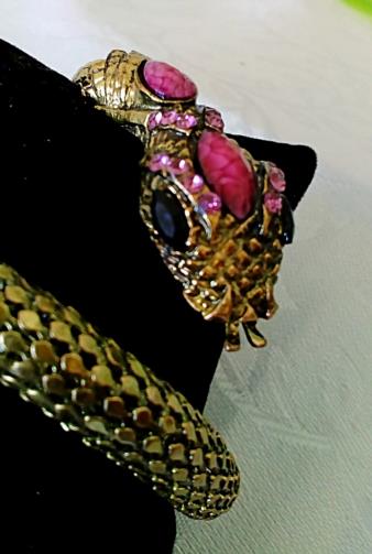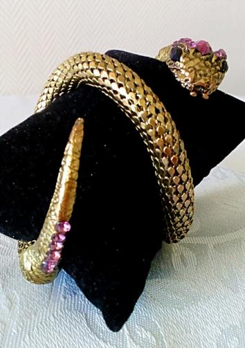 Peça em metal dourado maleável articular medindo 49cm em forma de cobra detalhada cravejado de pedras rosas. 35g