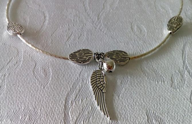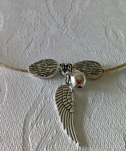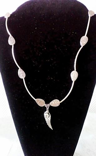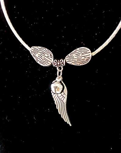 Pulseira-Colar Prateada articulada medindo 54cm adornada com 12 folhas em metal prateado e um pingente com uma Asa Prateada e uma esfera Prateada com um chocalho interno. ( Três voltas em torno no pulso e vira uma linda pulseira Sonora)