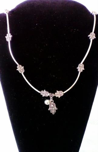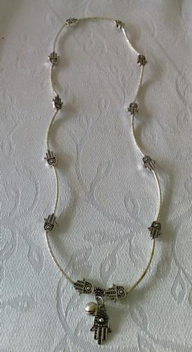 Pulseira-Colar Prateada articulada medindo 54cm adornada com 12 símbolos da Mão de Hansá em metal prateado e um pingente com a Mão de Hansá Prateada e uma esfera Prateada com um chocalho interno. ( Três voltas em torno no pulso e vira uma linda pulseira Sonora)