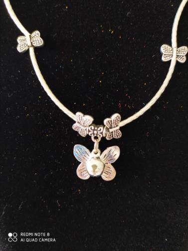 Pulseira-Colar Prateada articulada medindo 54cm adornada com 12 Borboletas em metal prateado e um pingente de Borboleta Prateada e uma esfera Prateada com um chocalho interno. ( Três voltas em torno no pulso e vira uma linda pulseira Sonora)