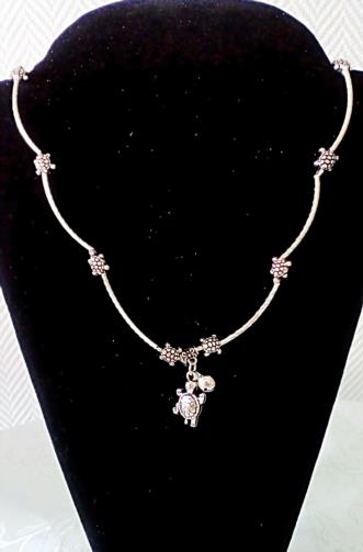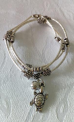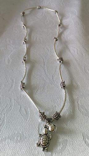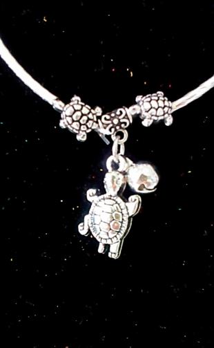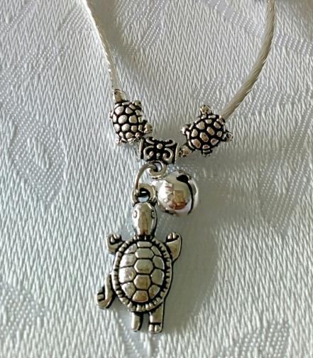 Pulseira-Colar Prateada articulada medindo 54cm adornada com 12 Tartarugas em metal prateado e um pingente de Tartaruga Prateada e uma esfera Prateada com um chocalho interno. ( Três voltas em torno no pulso e vira uma linda pulseira Sonora)