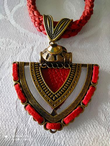 Peça em couro sintético e camurça de cor vermelha, adornado em metais dourados trabalhados em gramatura com pedra de efeito dourada e acabamentos medindo 42cm ajustável (+6cm).