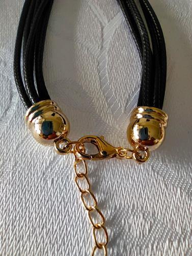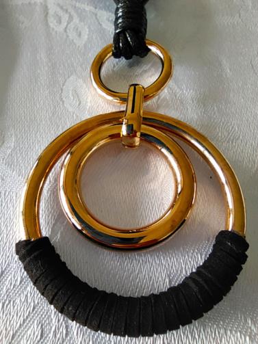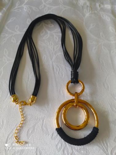 Cordão em couro sintético preto em 6 tiras com 3 argolas douradas sendo uma revestida em camurça preta medindo 74 cm.
