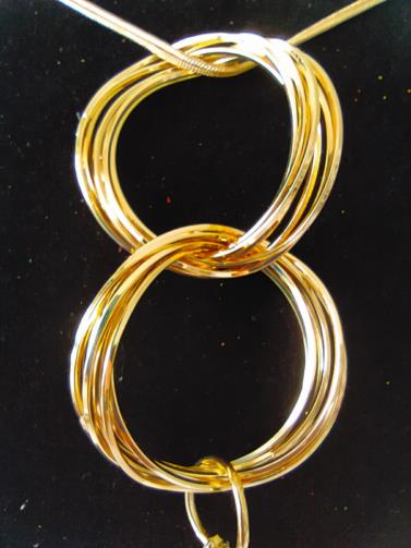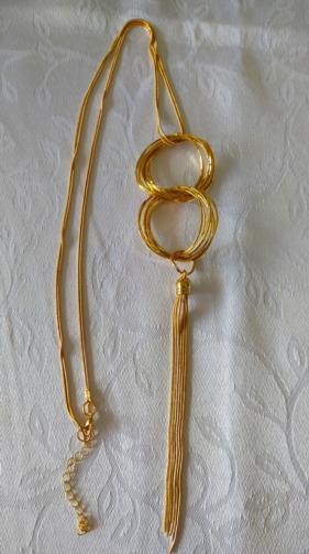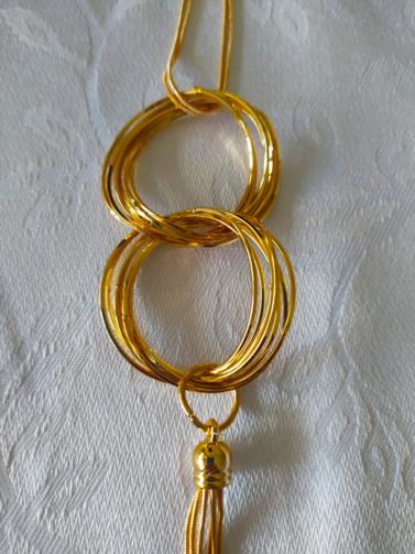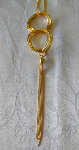 Cordão em metal dourado medindo 60 cm com 14 aros dourados entrelaçados medindo 4 cm e 6 flagelos dourados medindo 12 cm.