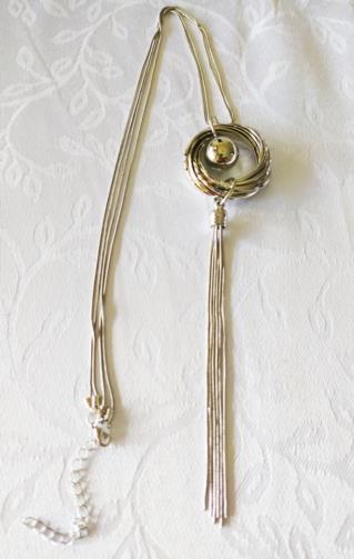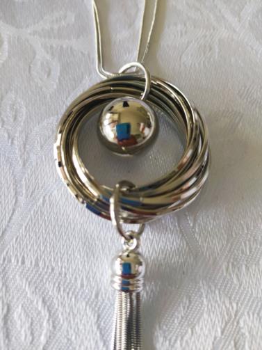 Cordão em metal prateado medindo 60 cm com 13 aros prateados entrelaçados medindo 4 cm, uma esfera prateada e 6 flagelos prateados medindo 12 cm.