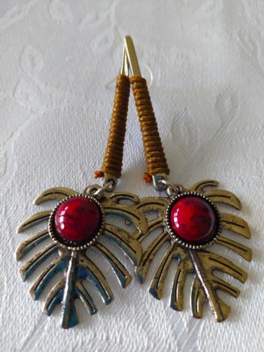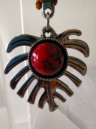 Peça em metal prateado medindo 8,5cm em forma de folha estilizada com uma haste coberta com sisal envernizado com um pingente de pedra vermelha.