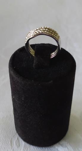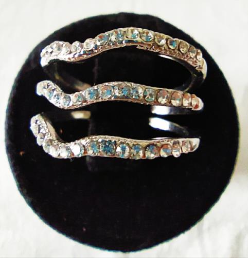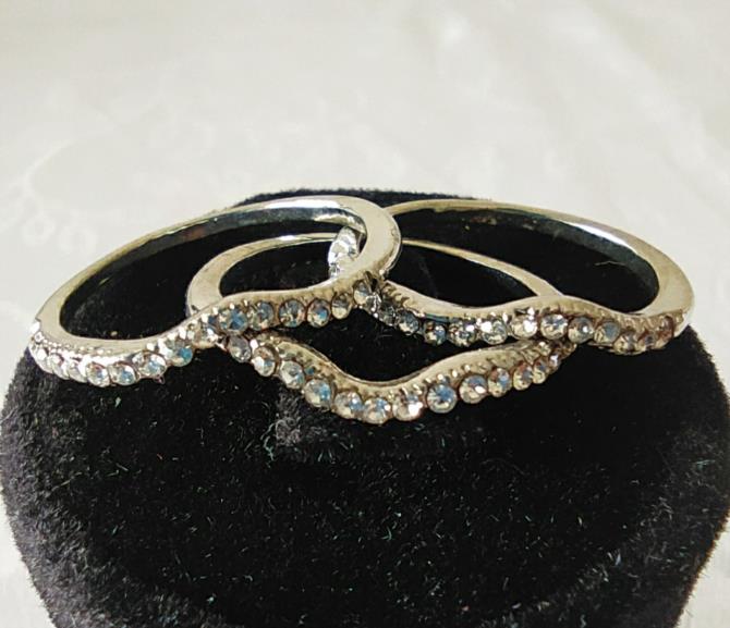 Três anéis em metal prateado cravejado de pedras de brilho em estilo, podendo usar todos em um dedo ou de forma separada ( um em cada dedo ). Nº18